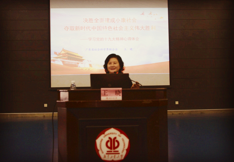 本网讯 11月14日下午,我校在大学城校园大讲堂圆弧报告厅召开党的十九大精神专题辅导报告。党的十九大精神广东宣讲团成员,广东省社会科学界联合会党组书记、主席王晓应邀作了题为“决胜全面建成小康社会,夺取新时代中国特色社会主义伟大胜利”的专题辅导报告。校党委书记、校长陈新主持报告会。