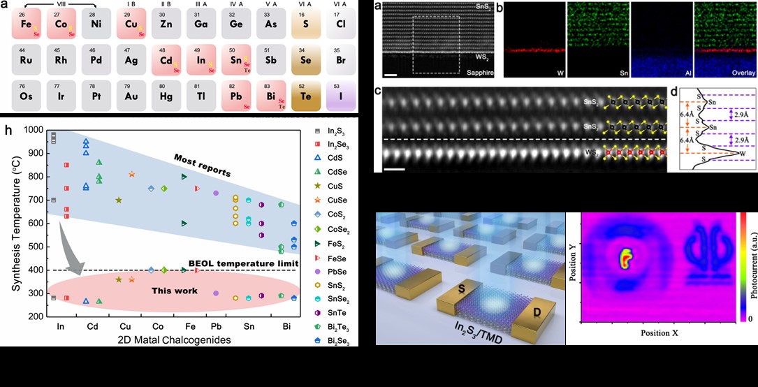 图1: 低温生长的17种二维MCs晶体;图2:多层SnS2/单层WS2 横截面原子级图像;图3:在TMD模板上生长的In2S3基光电探测器阵列示意图及室温下采集的双波段单像素光检测图像。