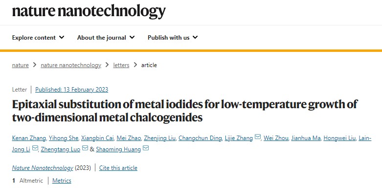 我校黄少铭教授团队有关二维金属硫族化物与异质结低温生长及器件应用以广工为第一作者单位(第一作者为博士后张克难博士,黄少铭教授为最后通讯作者), 以题为“Epitaxial substitution of metal iodides for low-temperature growth of 2D metal chalcogenides ”(金属碘化物外延替代二维金属硫化物低温生长)在国际顶级期刊Nature Nanotechnology (IF=40.52)上发表(论文链接:https://www.nature.com/articles/s41565-023-01326-1)。