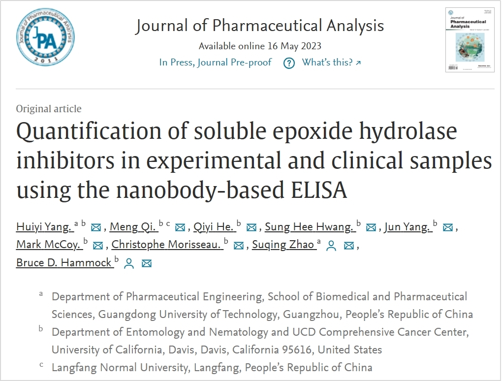 2023年5月,安博app最新版下载生物医药学院赵肃清教授团队在药学顶级期刊《Journal of Pharmaceutical Analysis》发表研究论文。论文题为“Quantification of soluble epoxide hydrolase inhibitors in experimental and clinical samples using the nanobody-based ELISA”(https://doi.org/10.1016/j.jpha.2023.05.006),该论文第一作者为我校生物医药学院20级博士研究生杨慧怡,通讯作者为赵肃清教授和Bruce D. Hammock院士。我校为论文第一完成单位,合作单位为美国加州大学戴维斯分校(University of California, Davis)。