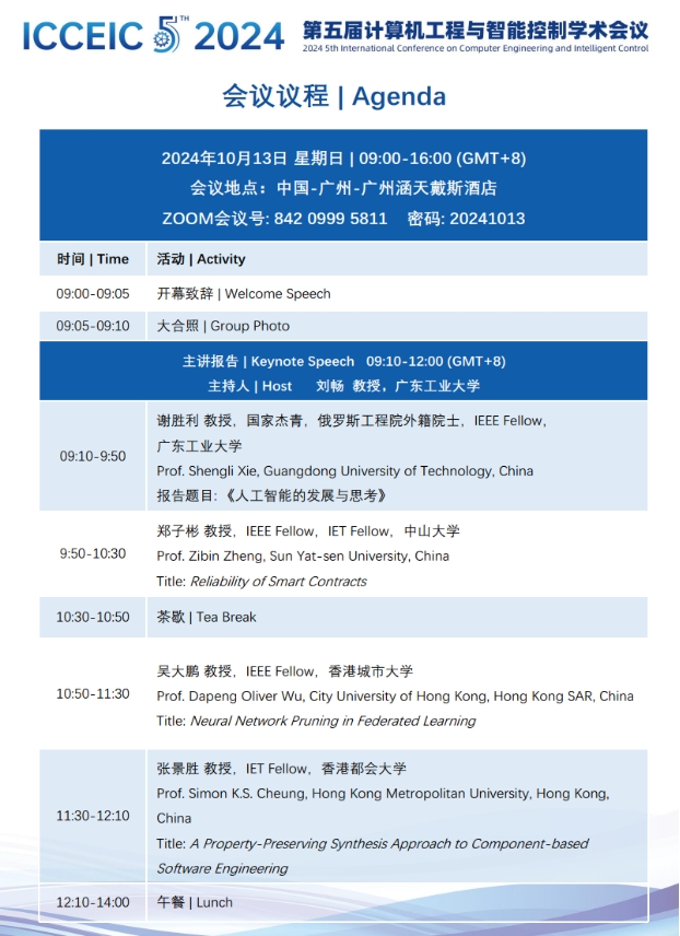 为促进计算机与控制科学领域学术交流和技术创新,由安博app最新版下载自动化学院、粤港澳离散制造智能化联合实验室主办,安博app最新版下载物联网智能信息处理与系统集成教育部重点实验室、智能检测与制造物联教育部重点实验室协办、广东省物联网信息技术重点实验室支持,广东省艾思信息化学术交流研究院承办的第五届计算机工程与智能控制学术会议(ICCEIC 2024)将于2024年10月13日在广州涵天戴斯酒店举办,聚焦计算机工程与智能控制前沿,涵盖网络安全、硬件系统、软件工程、嵌入式创新等多个核心议题及交叉学科研究。ICCEIC 2024将计算机工程和智能控制领域的创新学者和工业专家聚集到一个共同的论坛上,共享最新科研成果,破解关键问题,展望未来发展。