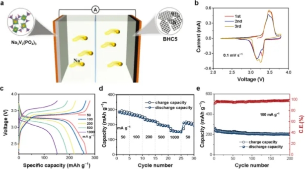 采用化学和谱学分析表征了选择性刻蚀后竹纤维的化学组成和结构。利用扫描电子显微镜(SEM)和高分辨率透射电子显微镜(HRTEM)分析了硬炭样品的形貌和微观结构,为该项工作工作研究提供了有力支撑。发现BHC具有不规则的块状结构,而通过刻蚀后的BHCX则表现出管状和块状共存的结构,说明刻蚀后保留的纤维素在碳化后更容易保持竹子的管状结构。四个材料均显示出典型的硬炭结构,由短程无序的碳层和纳米孔组成。经过刻蚀以后,无序的弯曲碳层逐渐被涡轮层结构和封闭孔隙取代,表明硬炭前驱体纤维素比例增加,能在高温碳化中形成更丰富的封闭孔结构。研究工作中还将BHC5和Na3V2(PO4)3组装成Na3V2(PO4)3–BHC5全电池测试。此结果表明BHC5在实际的钠离子电池中具有不错的应用前景。