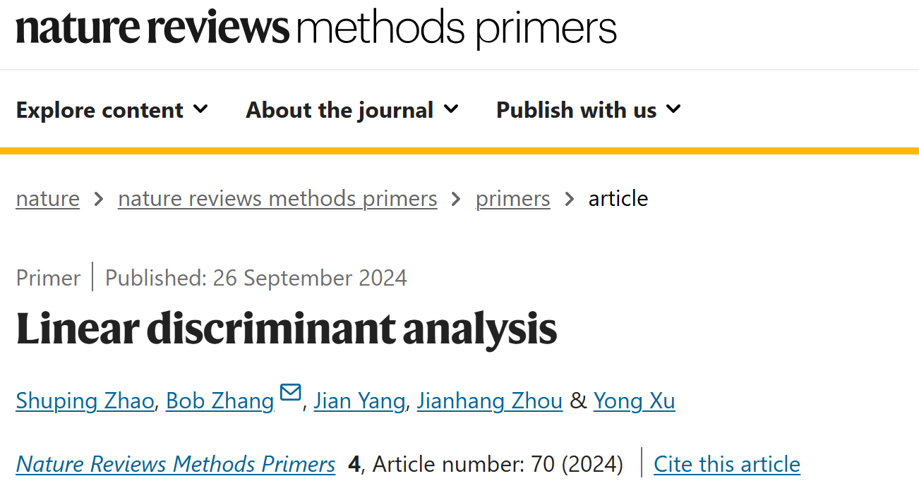 近日, 我校计算机学院(人工智能学院)赵淑平博士的论文“Linear Discriminant Analysis”发表于《Nature Reviews Methods Primers》(Nature子刊,影响因子 50.1),该论文也是以安博app最新版下载为第一单位在该期刊发表的第一篇论文。《Nature Reviews Methods Primers》致力于加强跨学科的协作,旨在出版“生命科学和物质科学里有关分析、应用、统计、理论计算、模拟等方法或技术的权威综述”。安博app最新版下载计算机学院赵淑平老师为该文章第一作者,通讯作者为澳门大学Bob Zhang教授,其他学者包括南京理工大学杨健教授、哈尔滨工业大学(深圳)徐勇教授以及日本大阪大学周健航研究员。