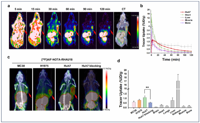 动物实验结果同样令人振奋。在多种实体瘤的荷瘤小鼠模型中,[18F]AIF-NOTA-RHAU18在肿瘤部位呈现出明显的信号富集,能够清晰地可视化肿瘤,且其药代动力学特性良好,安全性良好,显示了该探针在体内应用的可行性和有效性。该新型多肽探针结合 PET/CT 技术,能精准定位肿瘤靶点,有望发展成一种新靶点新机制的医学影像药物。