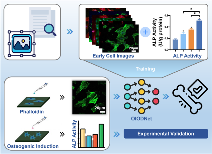 钛(Ti)及其合金植入物的表面改性对提升其促成骨性能至关重要。然而,由于植入物材料表面修饰导致的不同形貌以及影响材料表面特性的各种因素阻碍了植入物促成骨性能的标准化评价。此外,传统评价植入物表面促成骨性能的实验方法成本高,周期长,因此迟滞了对新型功能涂层的高效率筛选。鉴于细胞形态可以作为细胞对生物材料反应的早期指标,且人工智能技术已被用于预测干细胞的分化潜力,团队提出了一种基于早期细胞形态和深度学习的高通量、高效率筛选方法,用于评估植入物表面的促成骨性能。团队开发了“骨科植入物-成骨分化网络”(Orthopedic Implants-Osteogenic Differentiation Network,简称 OIODNet)预测模型。该模型通过学习钛及其合金植入物表面上的细胞早期形态与后续碱性磷酸酶(ALP)表达水平之间的联系,来预测植入物表面促成骨性能。OIODNet 集成了与图像识别和分类相关的经典深度学习模型AlexNet和ShuffleNetV2,在六项评价指标上均取得了超过 0.98 的优异性能表现。通过金属-多酚网络(MPNs)涂层和细胞实验进行验证,结果表明,OIODNet 的预测结果与实际的 ALP 活性值呈高度相关,证实了其基于早期细胞形态预测促成骨性能的准确性。基于模型开发的“成骨预测器”应用程序为OIODNet提供了一个直观的工具,便于用户通过上传早期细胞图像或连接显微镜实时拍摄早期细胞形态来预测其植入物表面的促成骨性能。