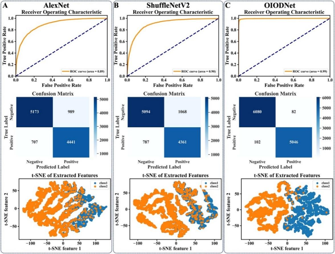 深度学习模型性能比较:AlexNet (A)、ShuffleNetV2 (B)和OIODNet (C)的损失/准确率曲线图、混淆矩阵图和t-SNE图。