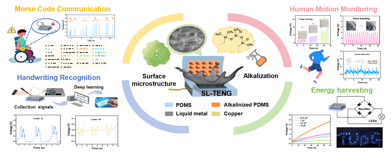 在实际应用方面,团队成功将该传感器集成于多个生物医学应用场景,包括生物能量收集、医疗通讯辅助、人体运动监测以及基于机器学习的书写识别系统等,充分展现了其在智能医疗领域的广阔应用前景。这项研究不仅为固-液界面工程提供了创新解决方案,也为下一代智能可穿戴医疗设备的发展开辟了新途径。