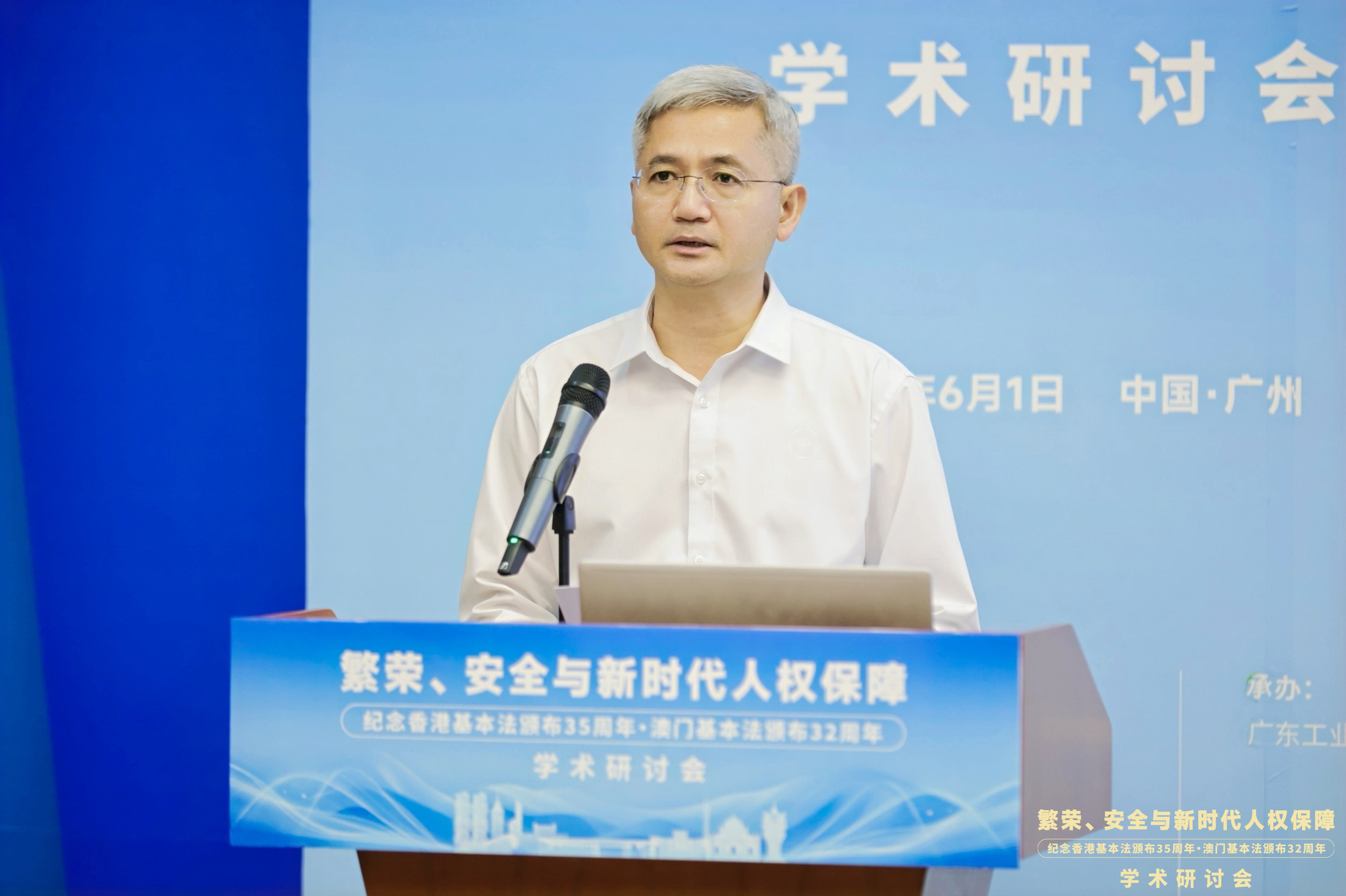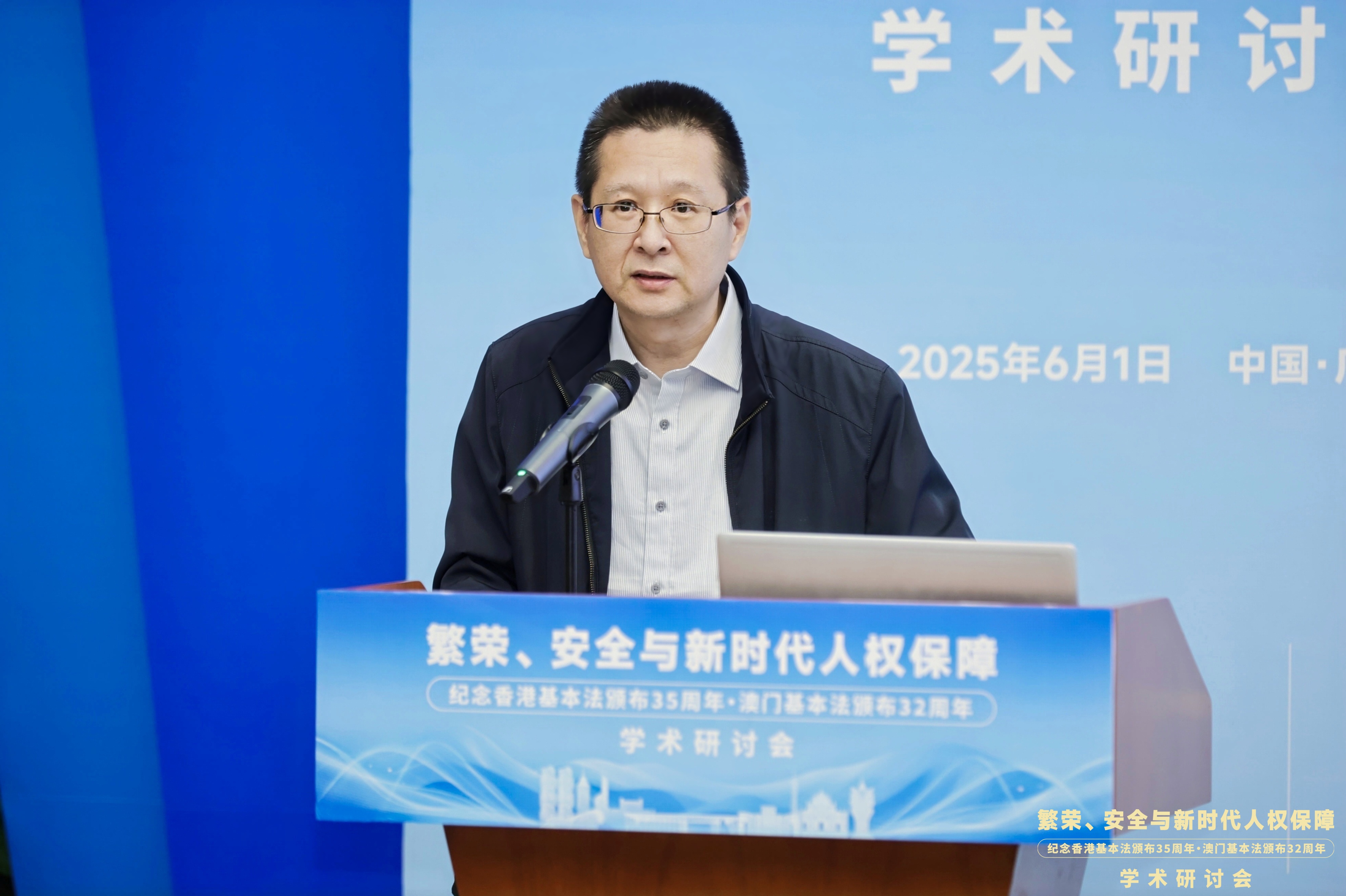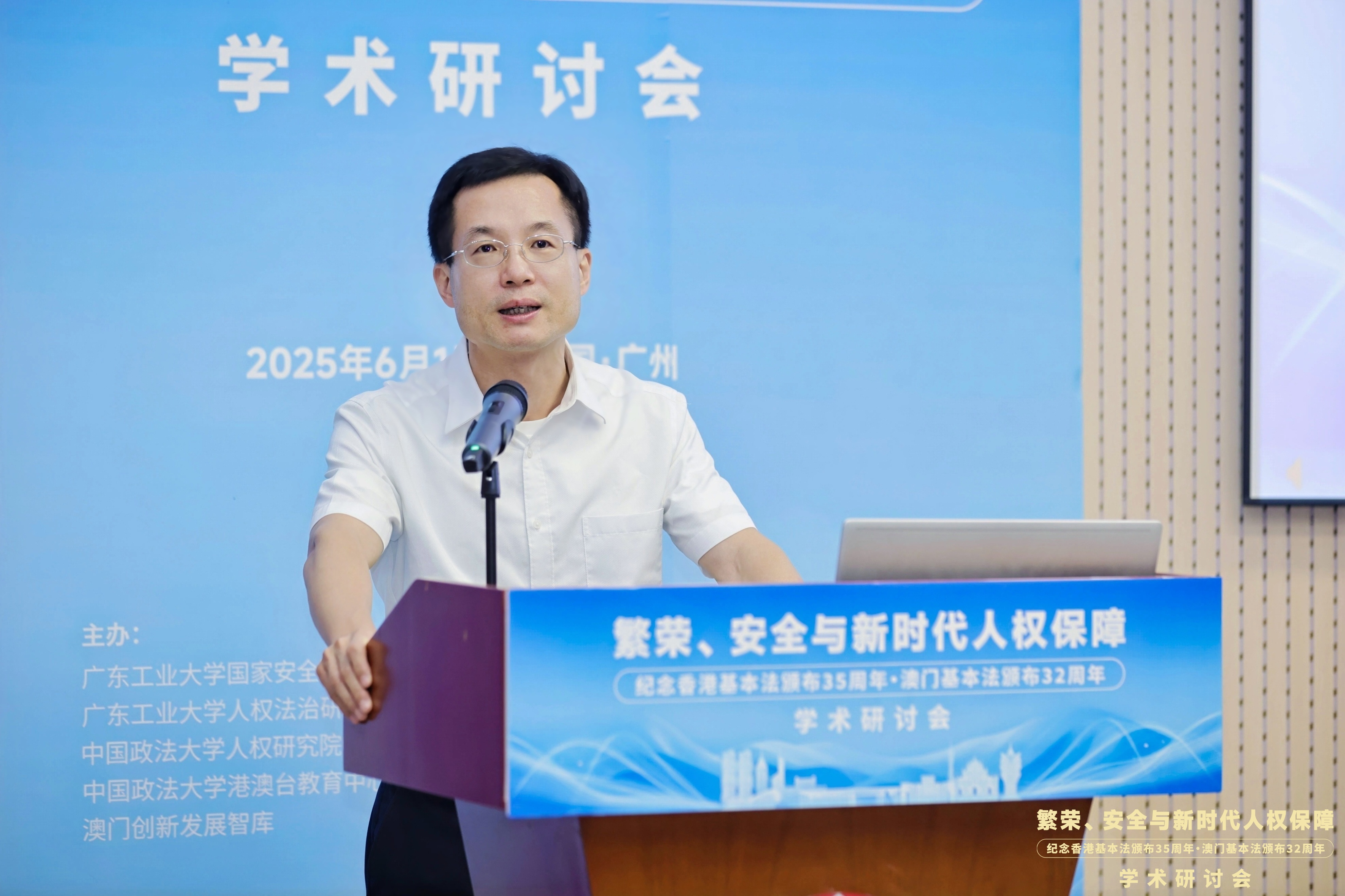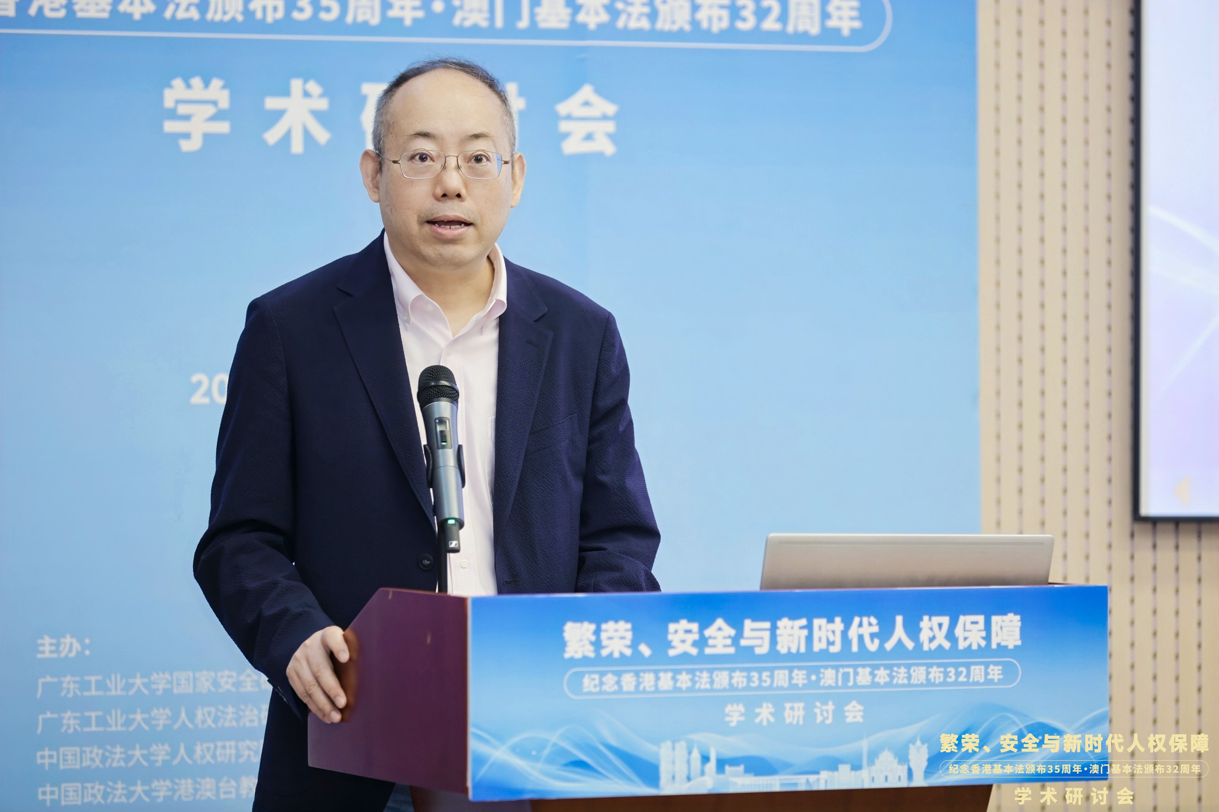6月1日,“繁荣、安全与新时代人权保障——纪念香港基本法颁布35周年、澳门基本法颁布32周年学术研讨会”在广东广州隆重举行。此次研讨会由安博app最新版下载国家安全研究中心、安博app最新版下载人权法治研究中心、中国政法大学人权研究院(当代法治研究院)、中国政法大学港澳台教育中心以及澳门创新发展智库联合主办,由安博app最新版下载法学院承办。来自国防大学、中国人民大学、中国社会科学院、吉林大学、中南大学、北京理工大学、中央民族大学、中南财经政法大学、华东政法大学、西南政法大学、云南大学、昆明理工大学、贵州财经大学、香港大学、香港城市大学、澳门大学、澳门城市大学、华南理工大学、暨南大学、深圳大学、广东外语外贸大学、广东财经大学、广州大学、肇庆学院、濠江法律学社、香港政策研究所等内地及港澳知名高校、研究机构的超过80位专家学者齐聚一堂,围绕国家安全法治、人权保障实践、粤港澳大湾区区域协同治理等核心议题展开深入研讨。