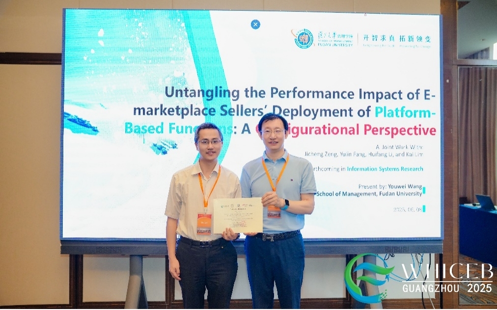 6月8日,大会安排了信息经济专题研讨会、CNAIS专题研讨会以及分会场宣读论文等平行分会场。信息经济专题研讨会以“数字经济与数字平台”为主题,由复旦大学王有为教授担任主席。哈尔滨工业大学张楠教授分享了题为《离线朋友能否触发情感承诺:网络重叠对社交媒体平台用户参与度的影响》的报告,王有为教授分享了《电子市场上部署平台功能对卖家绩效的影响:基于配置理论视角》的报告,华南理工大学牛保庄教授分享了《跨境电商中的渠道冲突、协调与韧性》的报告。