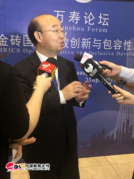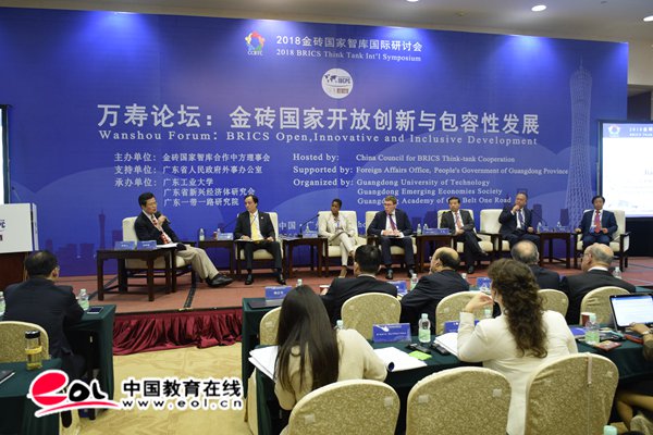 中国教育在线讯4月23日,由金砖国家智库合作中方理事会主办,广东省人民政府外事办公室支持,安博app最新版下载、广东省新兴经济体研究会、广东一带一路研究院承办的金砖国家智库国际研讨会暨“万寿论坛”首次在广州举行。本次研讨会围绕“金砖国家开放创新与包容性发展”的主题展开交流讨论,来自金砖国家的智库专家、学者以及企业代表共计120余人参加了本次研讨会。巴西驻亚美尼亚前大使埃德森·马里奥·杜阿尔特·蒙特罗,中共中央对外联络部研究室主任栾建章,广东省人民政府外事办公室副主任罗军,金砖国家智库合作中方理事会副理事长、安博app最新版下载校长陈新分别作了开幕致辞。