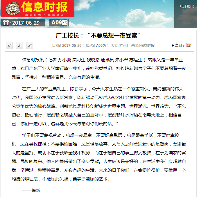在广工大的毕业典礼上,陈新表示,今天大家生活在一个尊重知识、崇尚创新的伟大时代。我国经济发展进入新常态,创新驱动已经成为经济社会发展的第一动力、成为国家谋求竞争优势的核心战略。创新尤其是科技创新成为世界主题、世界潮流、世界趋势。“不忘初心、砥砺前行、把创新之魂融入自己的血液中,把创新汗水挥洒在南粤大地上,相信自己,你们一定可以,这就是我今天最想对你们说的话。”