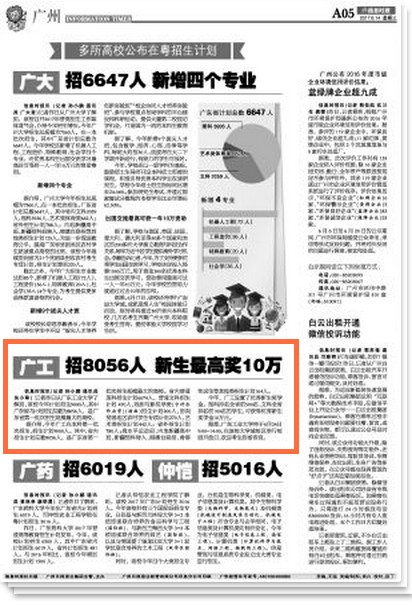 据介绍,今年广工在本科第一批次招生,招生计划9000人。其中,省内招生计划总数8056人,是广东省第一批次招生规模最大的高校。省内普通理科招生计划6674人,普通文科招生计划 470人,戏剧与影视学类(中外合作办学)(动画)招生计划200人,面向贫困地区农村学生专项计划270人,艺术类招生计划442人;省外招生计划780人;高水平运动员、内地新疆高中班、新疆预科转入、港澳台联招、香港免试生等其他类招生计划164人。