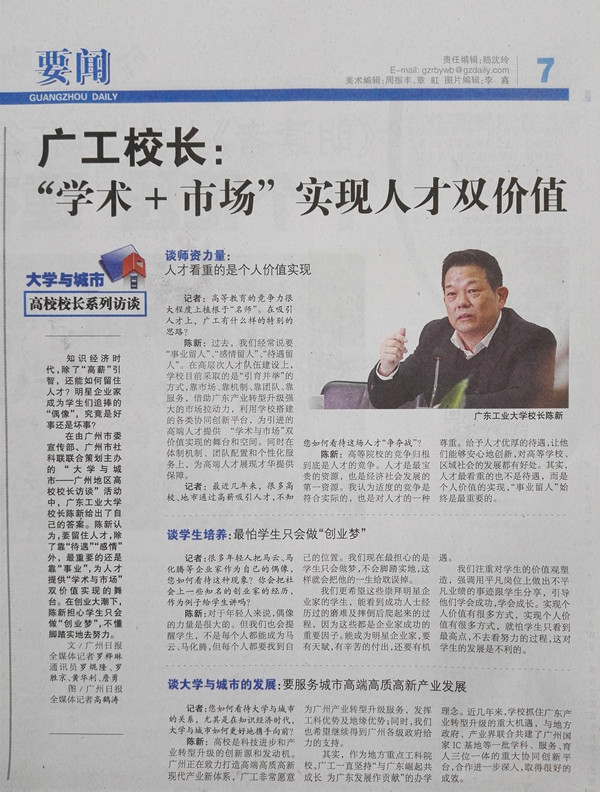 陈新:高校是科技进步和产业转型升级的创新源和发动机。广州正在致力打造高端高质高新现代产业新体系,广工非常愿意为广州产业转型升级服务,发挥工科优势及地缘优势;同时,我们也希望继续得到广州各级政府给力的支持。
