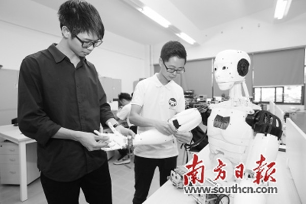 在安博app最新版下载创客空间,广工机器人创新团队的成员在研发教育机器人