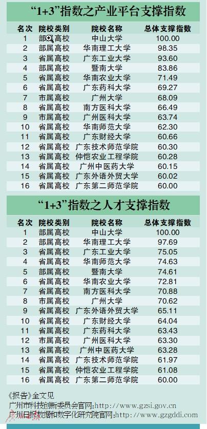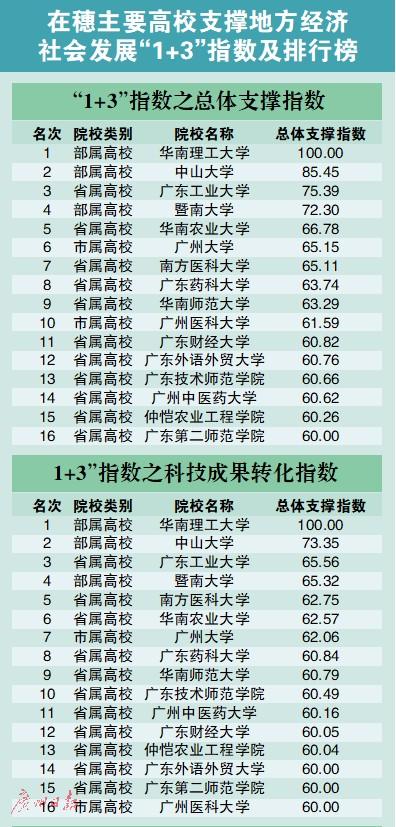《报告》制定出在穗主要高校支撑地方经济社会发展“1+3”指数及排行榜,其中“1”是指在穗主要高校支撑地方经济社会发展总体支撑指数;“3”是指科技成果转化指数、产业平台支撑指数、人才支撑指数3个子指数,《报告》主要从这三个方面确定指标体系,并以此衡量高校对广州经济社会发展的支撑能力。