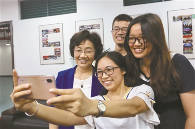 华工校长王迎军与新生代表玩自拍。