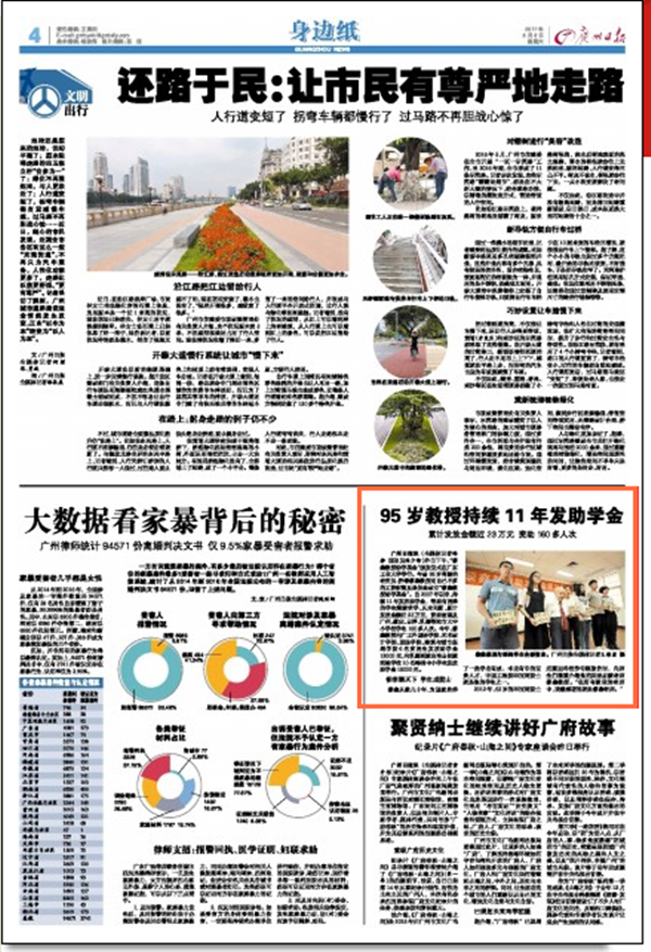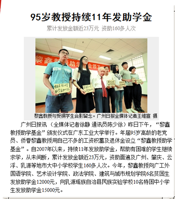 广州日报讯 (全媒体记者徐静 通讯员陈少徐)昨日下午,“黎鑫教授助学基金”颁发仪式在安博app最新版下载举行。年届95岁高龄的老党员、侨眷黎鑫教授用自己不多的工资积蓄及退休金设立“黎鑫教授助学基金”。自2007年以来,持续11年发放助学金,帮助有困难的学生继续求学,从未间断,累计发放金额近23万元,资助面遍及广州、肇庆、云浮、乳源等地市大中小学校学生160多人次。今年,黎鑫教授向广工外国语学院、艺术设计学院、政法学院、建筑与城市规划学院6名贫困生发放助学金12000元,向乳源瑶族自治县民族实验学校10名特困中小学生发放助学金15000元。(A4版)