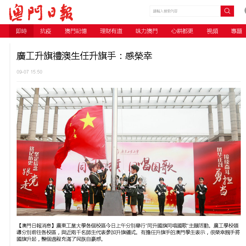 【澳門日報消息】廣東工業大學各個校區今日上午分别舉行“同升國旗同唱國歌”主題活動。廣工學校領導分别前往各校區,與近兩千名師生代表參加升旗儀式。有擔任升旗手的澳門學生表示,很榮幸親手將國旗升起,整個過程充滿了民族自豪感。