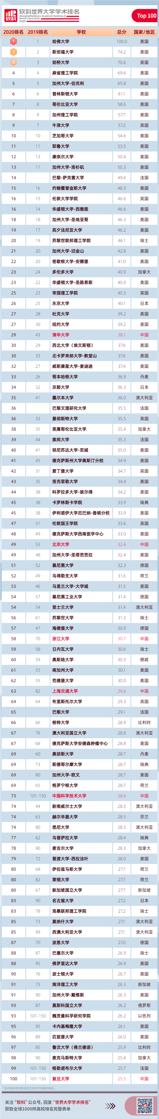 从全球来看,在今年的排名中,哈佛大学仍然稳坐头把交椅,连续第18年蝉联全球第一,斯坦福大学仅次于哈佛大学,继续保持全球第二名,剑桥大学保持全球第三。哥伦比亚大学和加州理工学院排名均上升1位,依次位列全球第七和第八。欧洲大陆的大学中,排名最高的是法国新近合并成立的巴黎萨克雷大学,首次上榜便高居全球第14名,同样入选法国“卓越大学计划”(IDEX)的巴黎文理研究大学和巴黎大学分别位居第36名和第65名。亚太地区的大学中,日本的东京大学表现最佳,位列第26名,清华大学(第29名)首次超过京都大学(第34名),赢得亚太地区亚军席位。大洋洲地区的大学中,澳大利亚的墨尔本大学(第35名)位居第一。