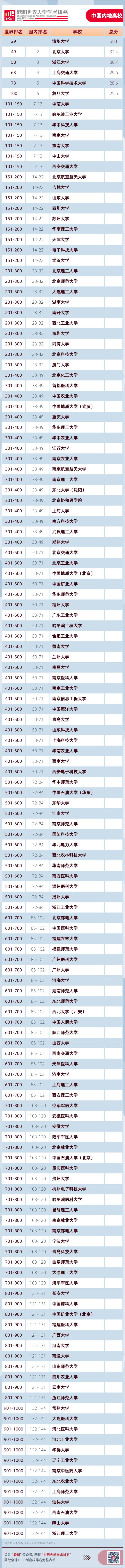 在全球1000强大学榜单中,今年中国内地共有144所高校上榜,上榜学校数较去年增加12所,其中71所高校入围全球500强,较去年增加13所。中国内地上榜高校中,86所高校排名名次或排名区间有所上升,51所高校排名区间保持稳定,体现了中国大学快速提升的学术水平和国际影响力。清华大学在中国内地排名最高,位列全球第29名。北京大学排名上升4名,首次入围全球50强,位列全球第49。浙江大学和上海交通大学排名持续上升,分别位列全球第58和第63。值得一提的是,中国科学技术大学和复旦大学进步明显,双双跻身全球百强,至此已有6所中国内地大学位列全球百强。