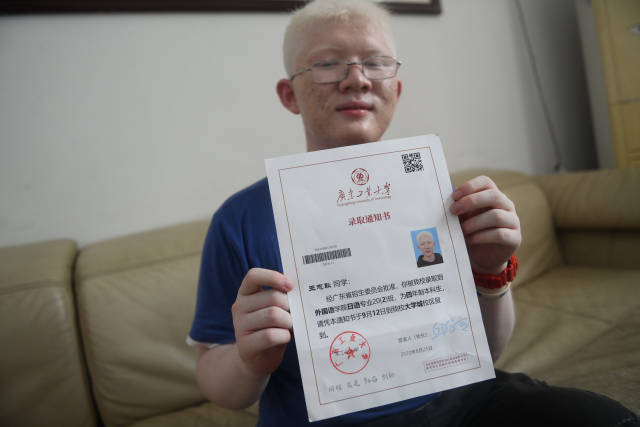 王志耿:一路上我得到很多鼓励,有对我不离不弃的父母,有对我一视同仁的老师,有对我贴心关怀的同学。希望我在大学能发挥优势特长,未来考取理工科研究生,最后做一名大学老师。同时,我也希望可以为白化病群体发声。