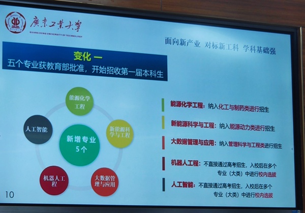5个专业分别是:能源化学工程、新能源科学与工程、大数据管理与应用、人工智能和机器人工程,这五个专业都是广工主动对接快速发展的广东产业市场需求,主动面向国家战略性新兴产业和粤港澳大湾区发展战略,不断调整和打造社会热需专业,培养高素质工程技术人才而开设的新工科专业,在广工都有强势的学科支撑。