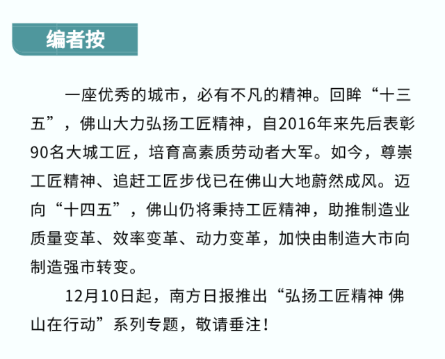 “我们要大力学习和弘扬工匠精神,打造更多百年老店、隐形冠军。”今年6月,在2020年“佛山·大城工匠”命名大会上,佛山市委书记鲁毅再次强调,要引导鼓励更多高技能人才到“专精特新”企业创新创业,通过植入精益求精的匠人精神和永续经营的发展理念,让企业竞争力得到持续提升。