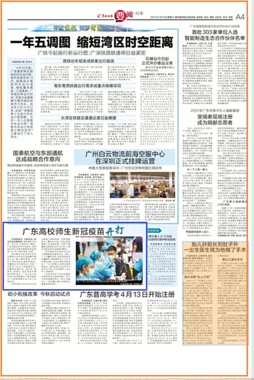 羊城晚报讯 记者陈亮、实习生李冰娜报道:疫苗接种正当时。连日来,记者走访了解到,广东各高校纷纷行动起来,有序组织师生自愿免费接种新冠疫苗,齐心协力构筑免疫“长城”。