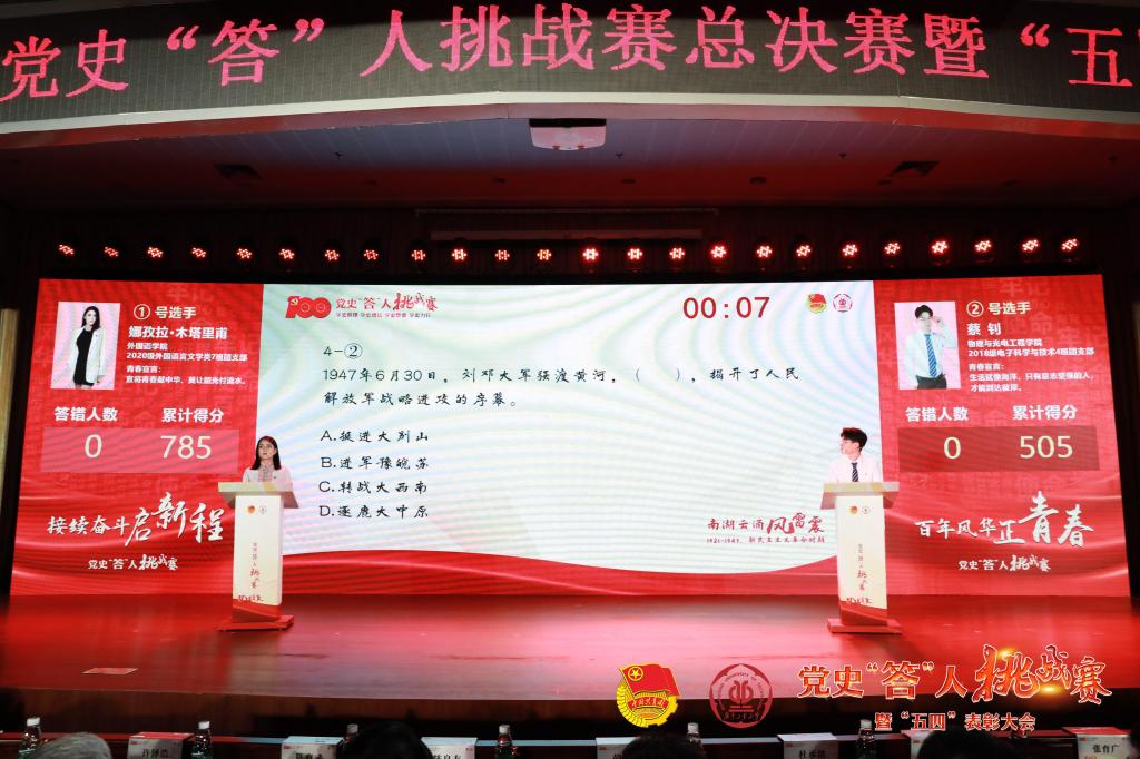 南都讯 记者 孙小鹏 实习生 梁颖怡 通讯员 卢迪 刁衍斌 为庆祝中国共产党成立100周年、纪念五四运动102周年,5月7日,安博app最新版下载团委在大学城校区举办安博app最新版下载党史“答”人挑战赛总决赛暨“五四”表彰大会。本次活动从线上海选、学院初赛、校区复赛,再到今天的全校总决赛,参与人数超过1万,答题人次超过14万。