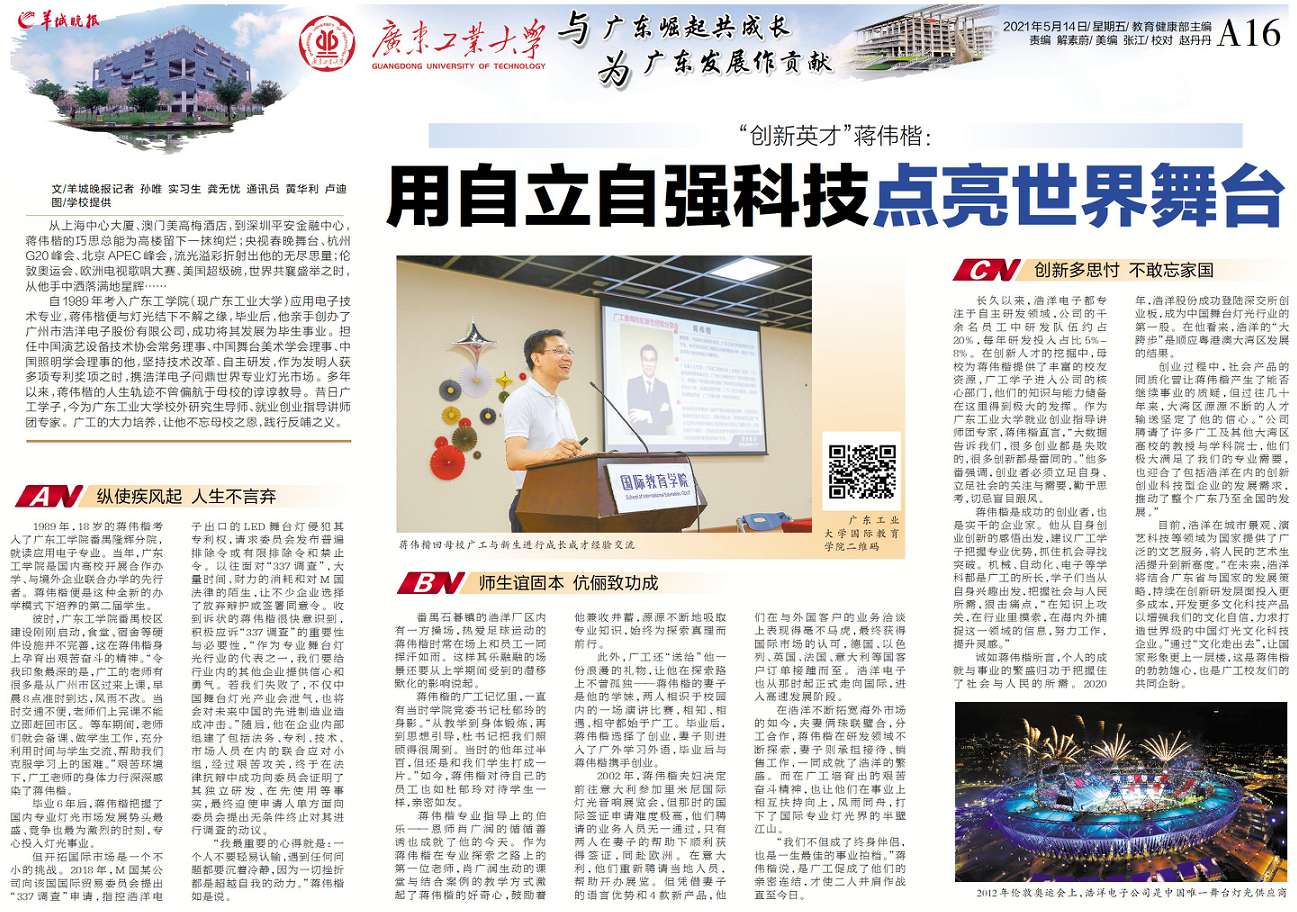 自1989年考入广东工学院(现安博app最新版下载)应用电子技术专业,蒋伟楷便与灯光结下不解之缘,毕业后,他亲手创办了广州市浩洋电子股份有限公司,成功将其发展为毕生事业。担任中国演艺设备技术协会常务理事、中国舞台美术学会理事、中国照明学会理事的他,坚持技术改革、自主研发,作为发明人获多项专利奖项之时,携浩洋电子问鼎世界专业灯光市场。多年以来,蒋伟楷的人生轨迹不曾偏航于母校的谆谆教导。昔日广工学子,今为安博app最新版下载校外研究生导师、就业创业指导讲师团专家。广工的大力培养,让他不忘母校之恩,践行反哺之义。