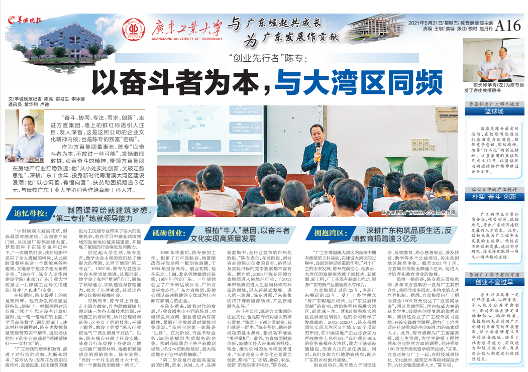 方直集团走过的23年,也是广东崛起的23年。受广工办学理念“与广东崛起共成长,为广东发展作贡献”的影响,他始终坚持深耕大湾区、瞄准珠三角。紧扣《粤港澳大湾区发展规划纲要》,他的公司制作了发展战略。2013-2020年,陈专带领团队实现大湾区8个城市40个项目的布局,在中国房地产企业综合实力百强榜单上名列80。“我们现在90%的业务量都在大湾区,致力于基础设施建设,改善人民的居住质量。同时,我们身体力行地助农扶农,配合广东的乡村振兴战略。”