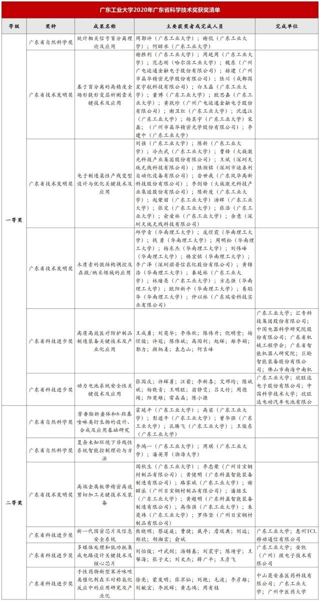 2020年度,广工作为第一完成单位获得省科技奖一等奖5项,一等奖数量再创历史新高,一等奖获得数并列全省第一,连续三年省科技一等奖获得数突破新高。同时,获批一等奖、二等奖都囊括三大奖种,全面开花,再次展现了高水平大学建设的新成果。