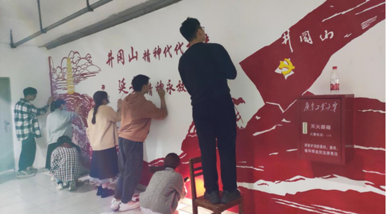 欲知大道,必先为史。环境设计学生党支部以跨越时空的“井冈山精神”和自力更生、艰苦奋斗的“延安精神”作为创作落脚点,用革命之色——红色作为全幅画面主色调,提取地方代表性建筑元素,进行简化再塑造后将其入画,描绘出了一幅恢弘壮丽的红色画卷,生动诠释了中国共产党人精神谱系的深刻内涵与时代风采。党员同志们通过主题墙绘创作,从中国共产党人精神谱系中筑牢信仰之基,砥砺初心使命,纷纷表示将增强历史责任感,与新时代同行,为新目标奋斗,在新征程建功。
