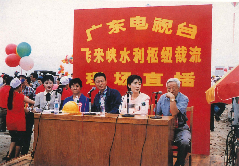 骆小筑(左二)在飞来峡水利枢纽工程现场直播