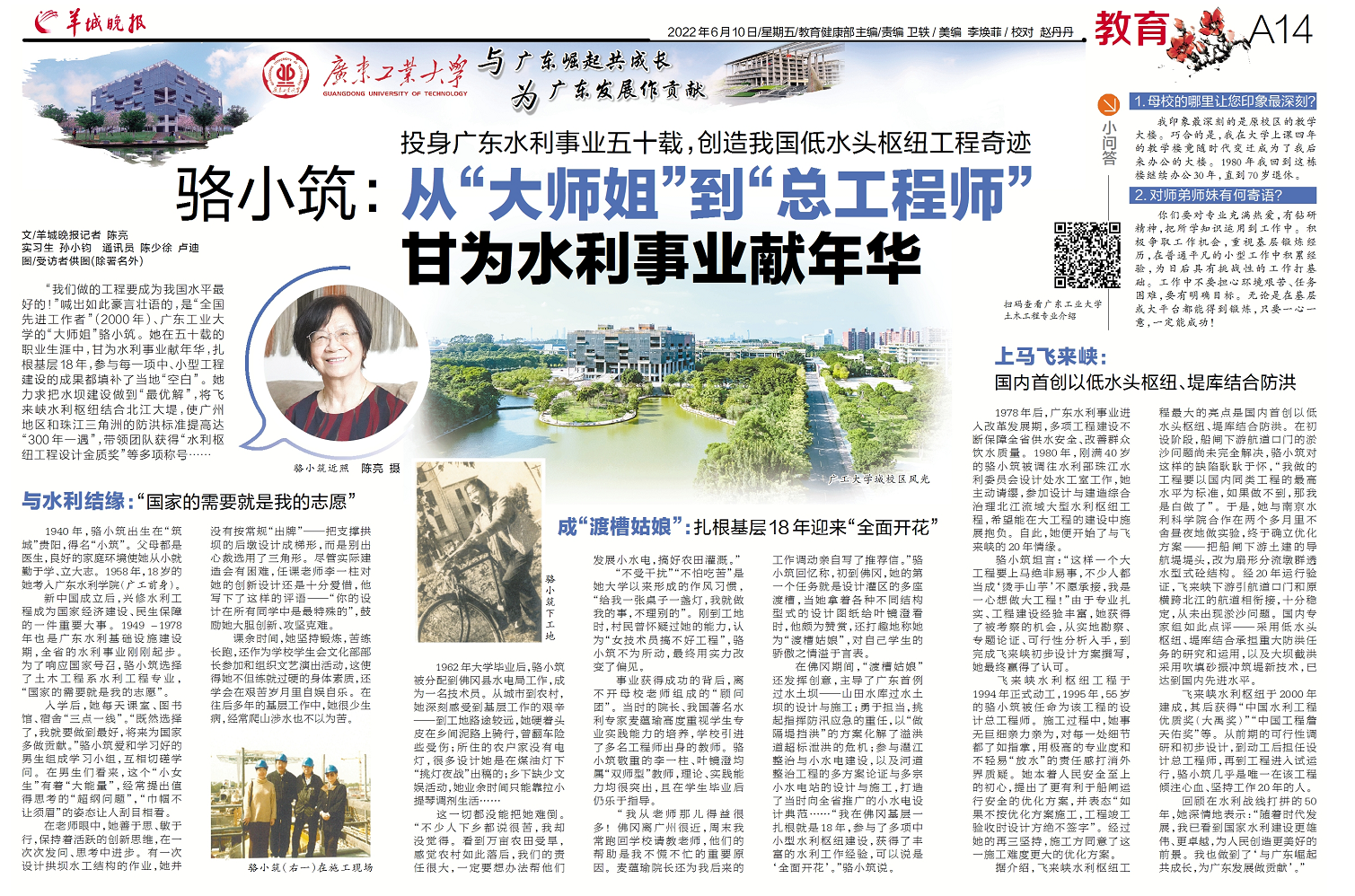 回顾在水利战线打拼的50年,她深情地表示:“随着时代发展,我已看到国家水利建设更雄伟、更卓越,为人民创造更美好的前景。我也做到了‘与广东崛起共成长,为广东发展做贡献’。”