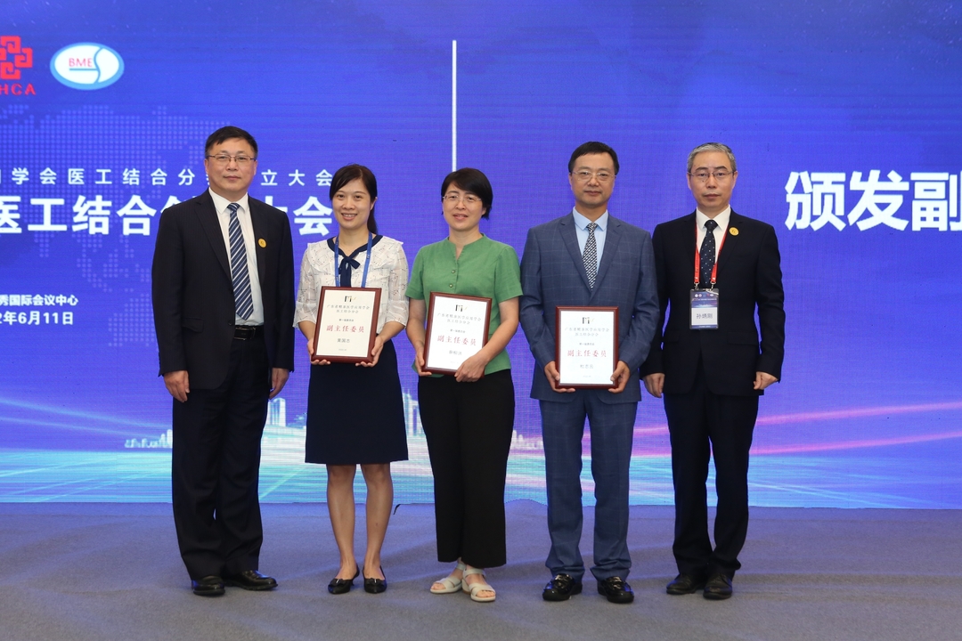 广东省精准医学应用学会常务副会长兼秘书长孙炳刚和广东省精准医学应用学会医工结合分会主任委员王成勇一同为副主任代表颁发副主任委员铭牌。