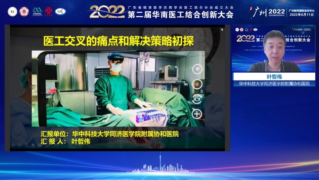 华中科技大学附属协和医院智能医学研究室主任叶哲伟以对智能医学方向的系统探索和《智能医学》国家教材体系的创建为切入点,介绍了高维度医学信息的可视化,实现5G环境下混合现实云平台远程会诊手术。