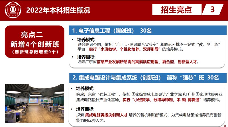 二是增加创新班和招生专业。广工瞄准广东产业对“高精尖缺”人才的需求,今年新增了电子信息工程(腾创班)、集成电路设计与集成系统(创新班)、城乡规划(国土空间规划创新班)、 翻译(创新班)、生物医学工程专业。其中,创新班采用小班制、导师制、项目制等培养模式,实施个性化培养,并在“推荐免试攻读研究生”方面增加名额、提高比例,打通“本-硕-博”升学通道,着力培养粤港澳大湾区重点产业发展所亟需的研究型、创新型拔尖人才。