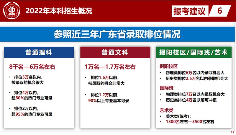 广工揭阳校区采用单独院校代码招生,省内普通物理类考生排位6万名以内、普通历史类排位2.5万名以内,录取概率较高;广工本科国际班采用单独院校专业组招生,省内普通物理类考生排位7万名以内、普通历史类排位4万名以内,有较大机会被录取。