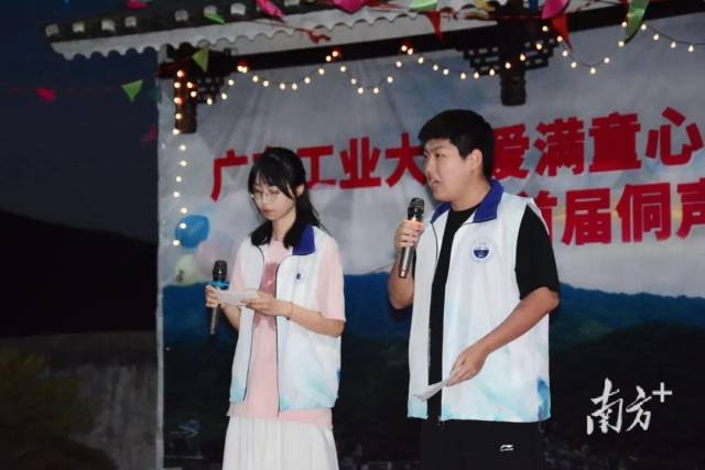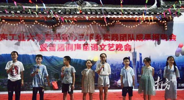 暮色渐晚,蝉声起伏,苗族的阿哥阿妹们深情对唱颇具苗族特色的《四乡歌》,随后孩子们也加入舞台,欢快地唱起了童谣。这是广工实践团策划举办的特色乡村音乐会,现场热闹非凡。