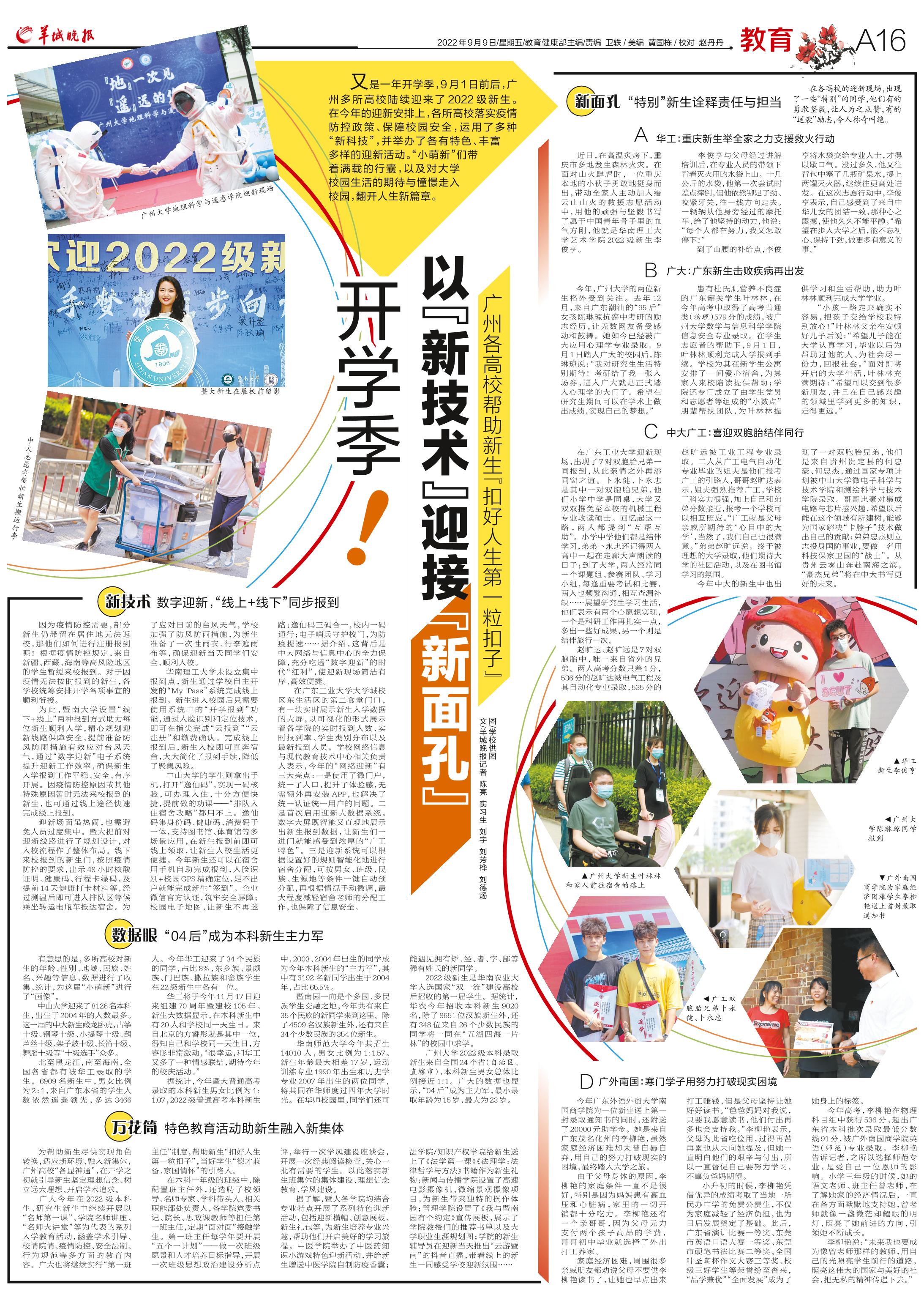 又是一年开学季,9月1日前后,广州多所高校陆续迎来了2022级新生。在今年的迎新安排上,各所高校落实疫情防控政策、保障校园安全,运用了多种“新科技”,并举办了各有特色、丰富多样的迎新活动。“小萌新”们带着满载的行囊,以及对大学校园生活的期待与憧憬走入校园,翻开人生新篇章。