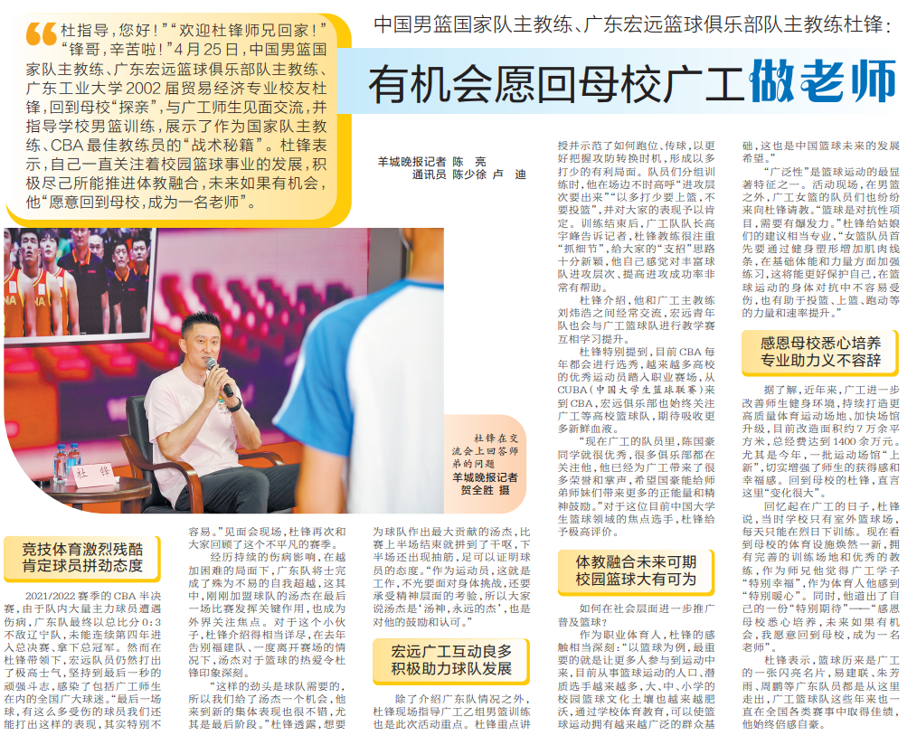 杜锋表示,篮球历来是广工的一张闪亮名片,易建联、朱芳雨、周鹏等广东队员都是从这里走出,广工篮球队这些年来也一直在全国各类赛事中取得佳绩,他始终倍感自豪。