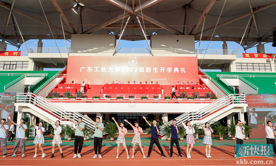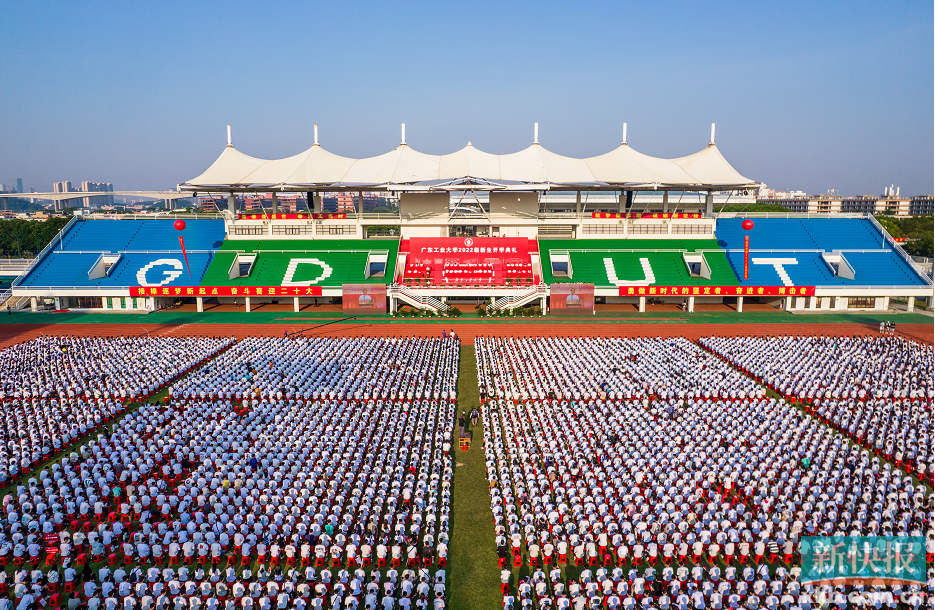 仲秋时节早上七时许,广州的太阳依旧火辣,但广工2022级的14000名新生早已整齐地坐在学校的田径运动场,等候着开学典礼的开始。