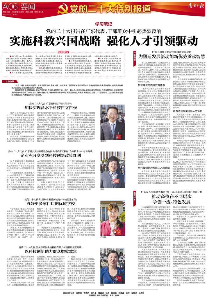 报告蓝图宏伟、路径清晰,引发广东代表、干部群众热烈反响。他们一致认为,报告为深入实施科教兴国战略、人才强国战略、创新驱动发展战略进一步指明了方向、提供了根本遵循,让人倍感振奋、倍增干劲,要坚持教育优先发展、科技自立自强、人才引领驱动,为加快建设教育强国、科技强国、人才强国作出广东贡献。