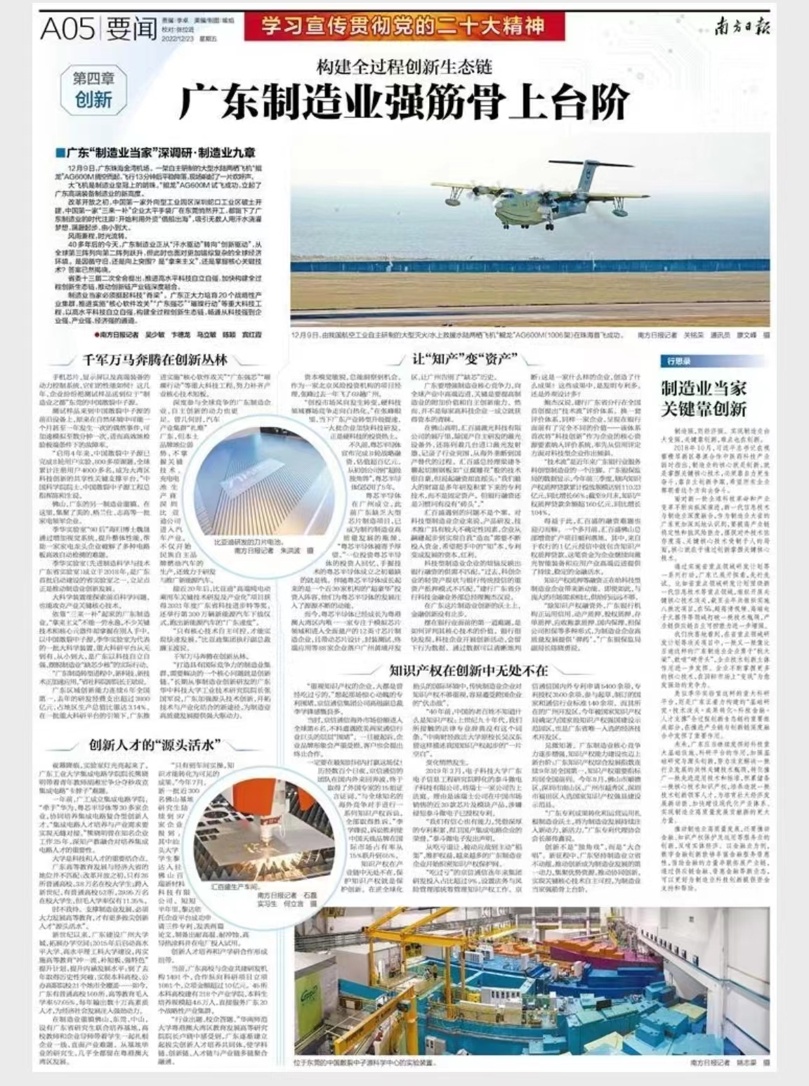 大飞机是制造业皇冠上的明珠。“鲲龙”AG600M试飞成功,立起了广东高端装备制造业的新高度。