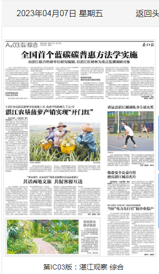 作为全省最大的海洋城市,湛江在蓝碳探索开发的道路上一直先试先行。2021年6月,我国首个蓝碳交易项目——湛江红树林造林项目首笔5880吨的碳减排量转让协议在青岛签署。同年12月,湛江启动建设“红树林之城”,红树林碳普惠方法学的制定成为其中一项重要工作。2022年4月,湛江成立湛江红树林湿地保护基金会和红树林保护研究中心,市委召开工作会议,专题部署海洋蓝碳开发交易等工作。