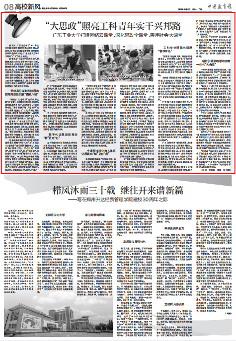 “大思政”出成果见成效,广工形成了《信息化时代高校思想政治教育与课程建设融合发展》等4本研究专著,以及数十篇论文成果。学校获批广东省高校“三全育人”体制机制建设试点单位、“八个相统一”高校思政课建设示范点培育单位。