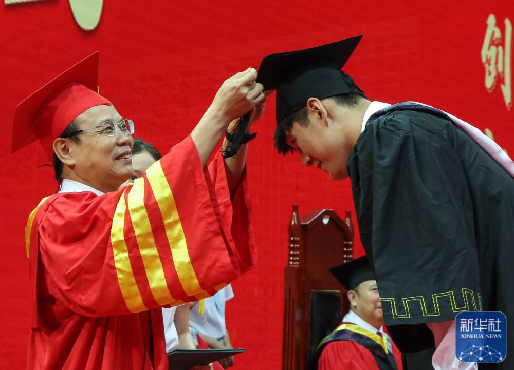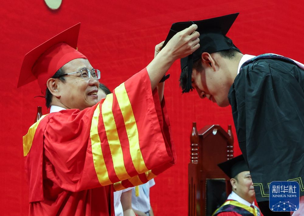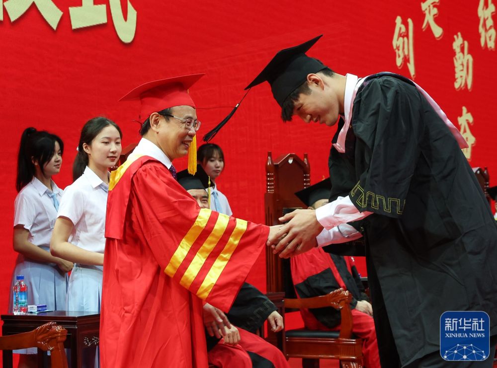 ↑6月28日,安博app最新版下载校长邱学青(左)为陈国豪拨穗。