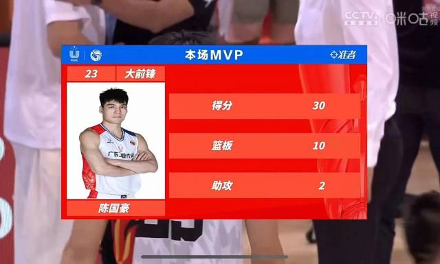 全场比赛,陈国豪贡献30分、10个篮板,荣膺总决赛MVP。