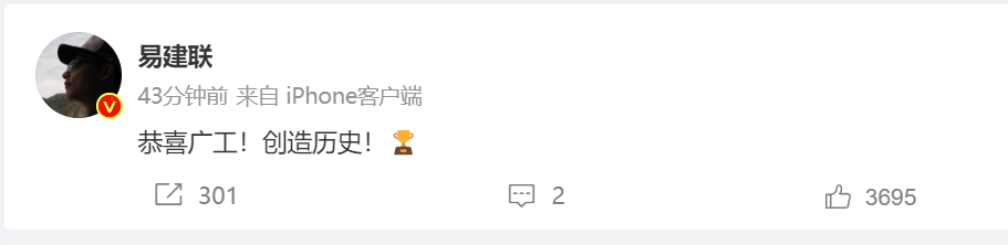 易建联、杜锋等也在微博发文祝贺广工夺冠,创造历史↓↓